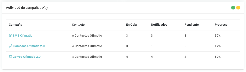 | Progreso | Muestra a nivel de porcentaje cuanto el falta a la campaña para concluir las notificaciones del dia. |