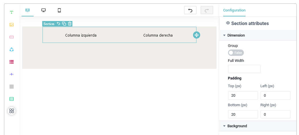 - Manejador de Secciones: Este permite agregar una sección la cual por defecto viene con dos columnas, pero esta puede modificarse utilizando el apartado de