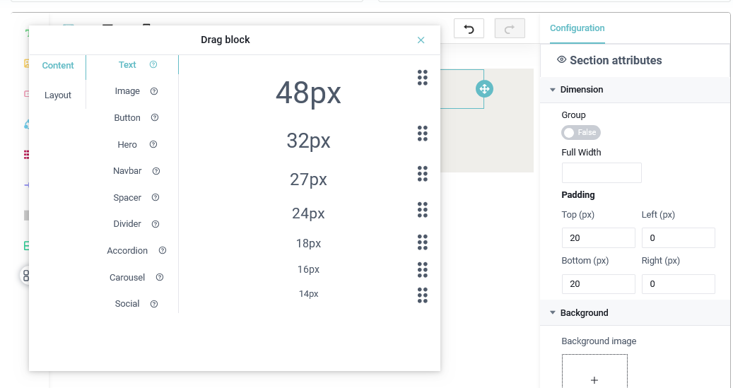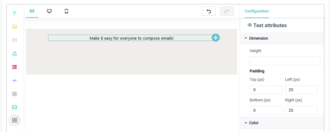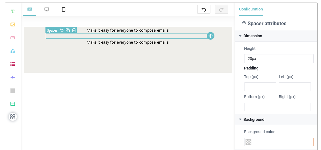 - Manejador de Espaciadores: Este permite agregar un espacio en blanco para poder dividir los contenidos que tengamos en nuestra plantilla de email, si queremos modificar esto podemos utilizar el apartado de