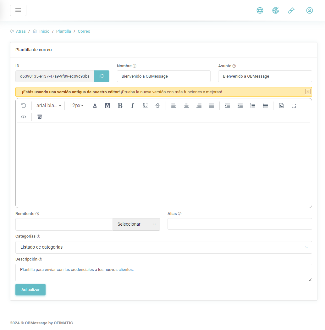 En este aparatado podrá crear una plantilla de mensajes para correo.