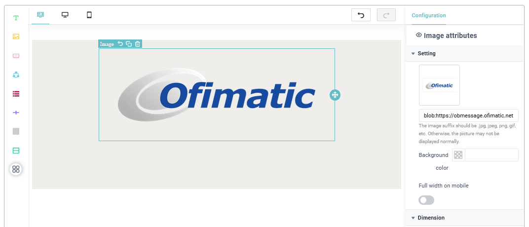 - Manejador de imagenes: Este permite agregar una imagen en el correo, esta imagen puede ser tanto custom como alguna de las que tenemos ya definidas, puede cambiar todas las propiedades de la imagen usando el apartado de
